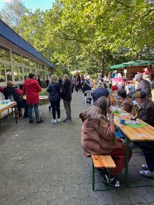 Wer kreativ sein wollte konnte mit dem Ev. Familientreff schöne Glocken aus Blumentöpfen basteln oder mit dem BUND Gartenschläferhäuschen basteln. Ein tolles Highlight für die Kinder außerdem das historische Kinderkarussell. Die Gemeindeschwester+ war mit einem Glückrad vertreten, welches verschiedene Bewegungsübungen bereithielt. Auch kulinarisch wurde einiges geboten, der ASB gab fleißig Kaffee und Kuchen aus, während der LCC alkohlfreie Getränke und den beliebten Zwiebelkuchen und Federweißen ausgab. Im JUCA konnte man sich leckere Falafelburger schmecken lassen. Natürlich wurde auch auf der Bühne einiges geboten, nach einem stimmungsvollen Einstieg mit dem Thema "Ankommen im Grünen" begrüßte der neue Ortvorsteher, Alper Kömür, und die beteiligten Akteur:innen die Besucher:innen des Festes. Die Karate-Kindergruppe von Arc-en-ciel und das Mitmach-Tanzangebot vom Tanzclub Rot-Weiß Casino sorgten für zusätzliche Unterhaltung.
